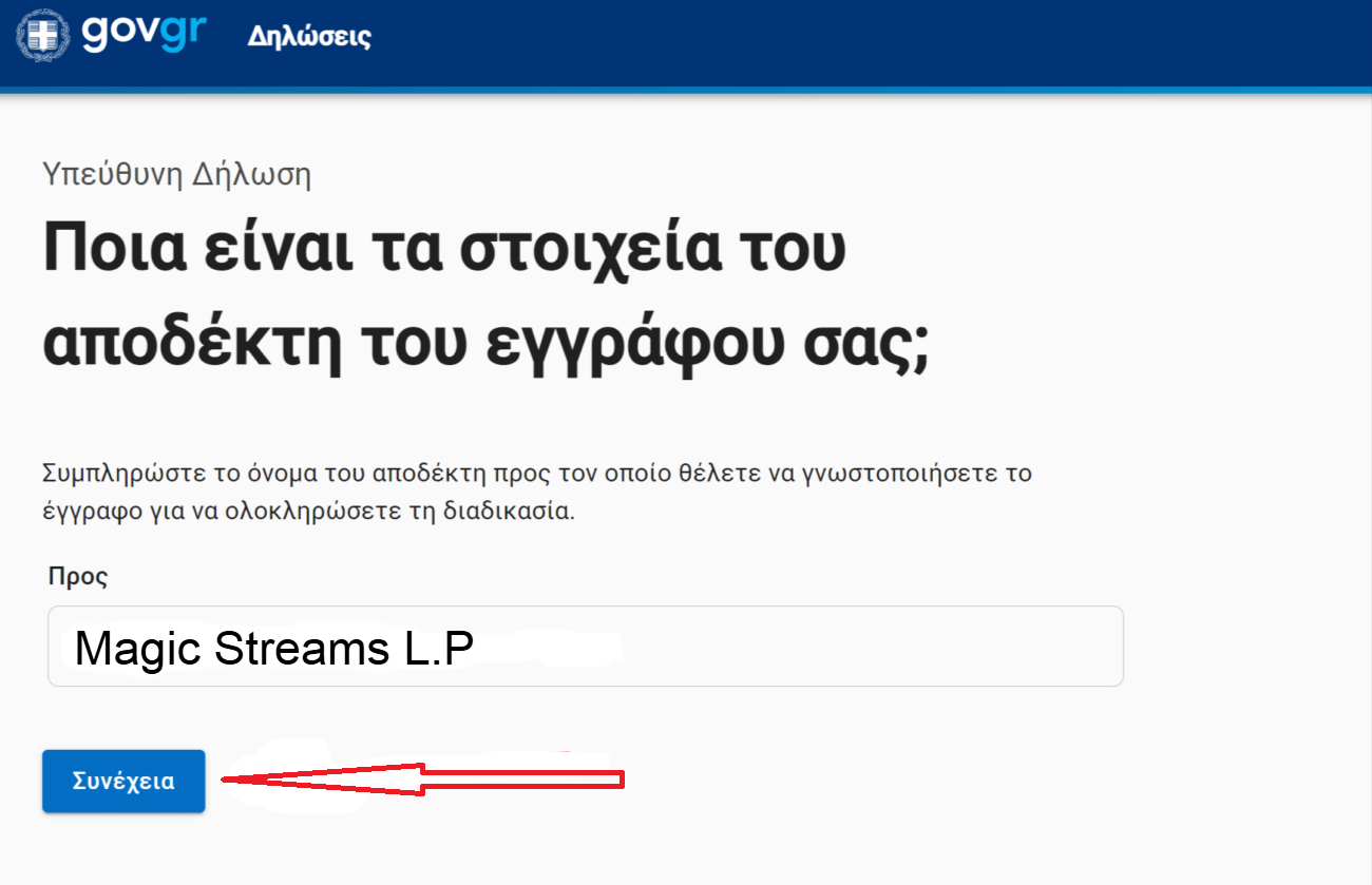 Στα στοιχεία αποδέκτη του εγγράφου, πρέπει να γράψεις “Magic Streams L.P”, όπως φαίνεται στην εικόνα..